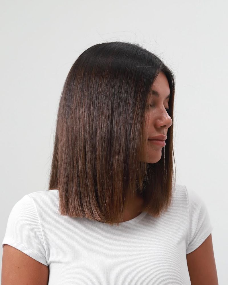 Elegance personified, this sleek brunette lob is perfect for any occasion. Its smooth texture and precise cut add a touch of sophistication. Whether paired with a formal outfit or casual attire, this hairstyle promises to turn heads everywhere.
