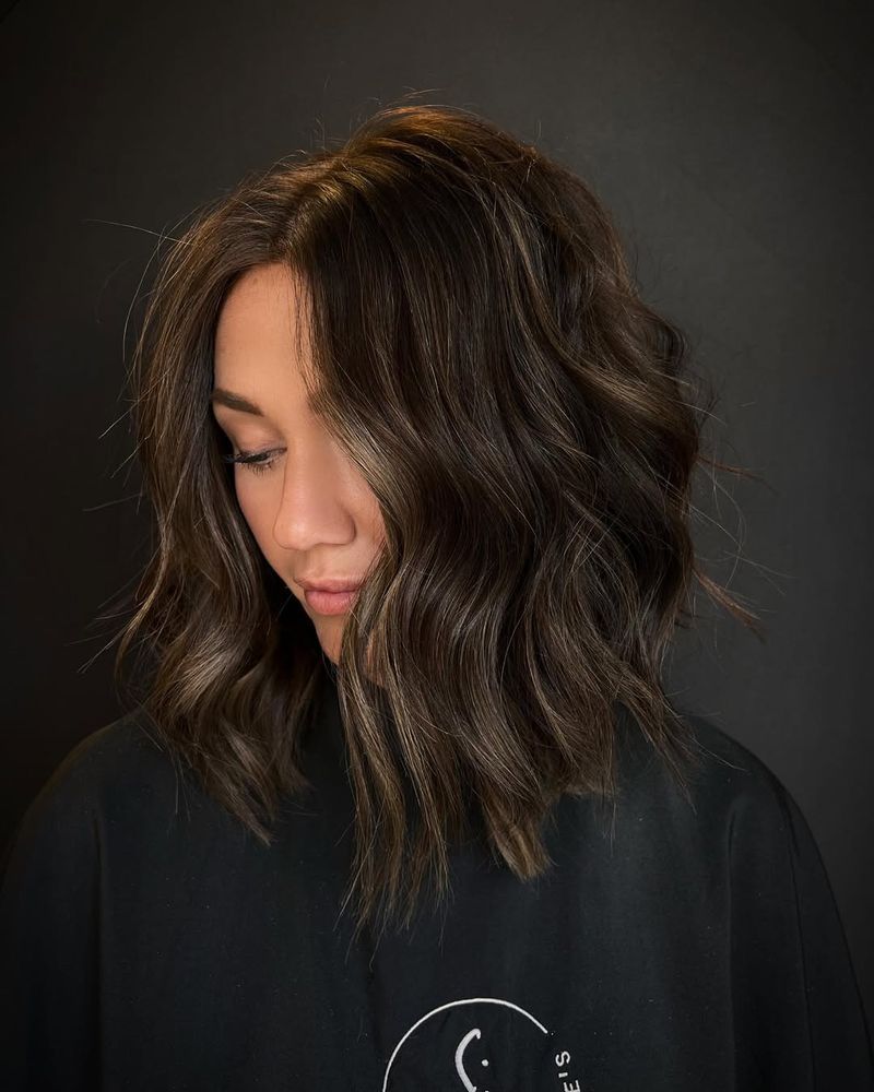 Embrace texture with this chic brunette lob hairstyle. The layers and tousled finish create a dynamic look that exudes confidence. It’s perfect for those who want a hairstyle that speaks volumes without shouting.
