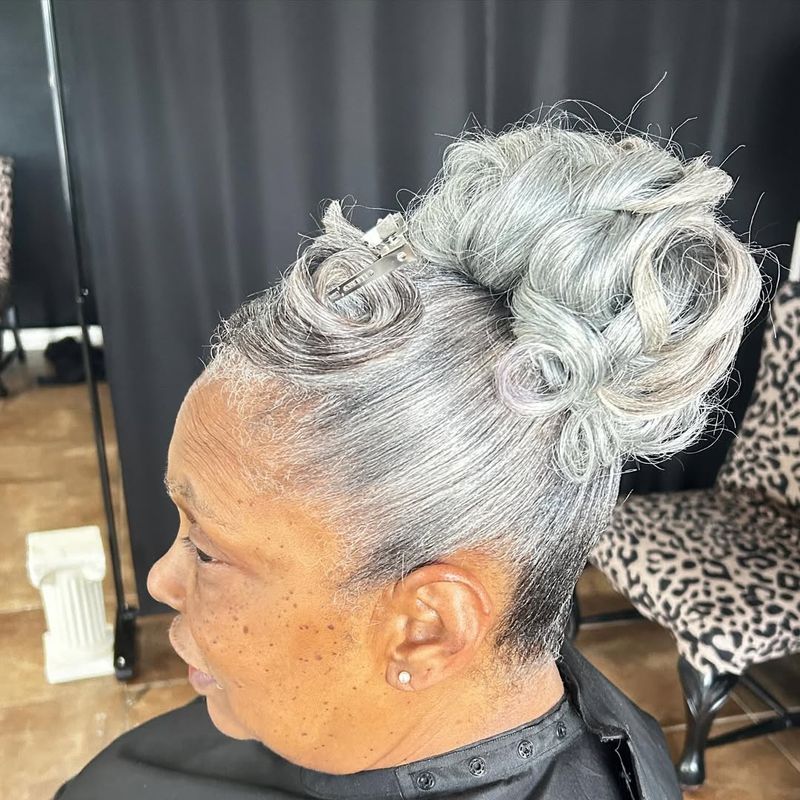 The elegant chignon is a classic updo that exudes sophistication. It’s an ideal choice for formal occasions, showcasing the smooth texture of gray hair. This hairstyle is a timeless favorite, offering a touch of class and grace to your ensemble.