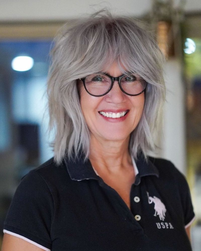 A layered lob is versatile and modern. This cut flatters any age and pairs well with cozy bookstore visits.