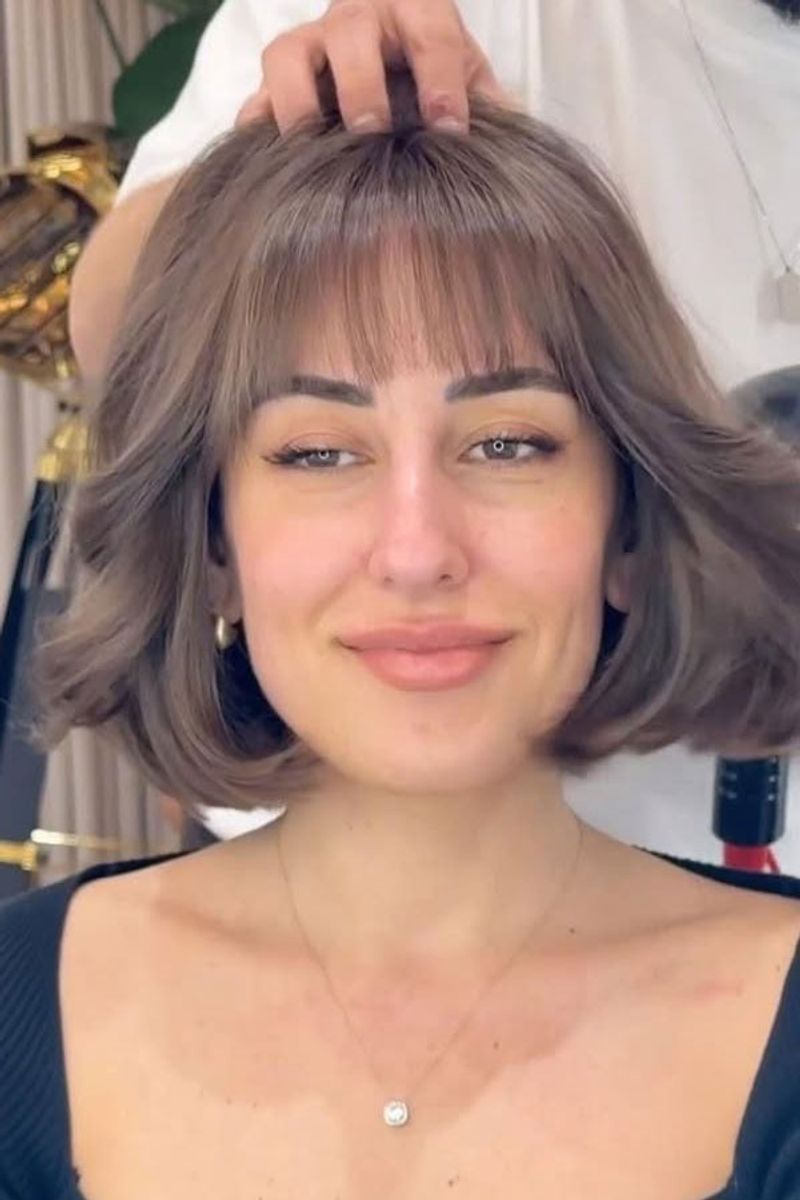 This geometric cut creates the illusion of thickness through its strong, curved shape. The full fringe draws attention to your eyes while disguising a thinning hairline. Incredibly flattering for heart-shaped faces!