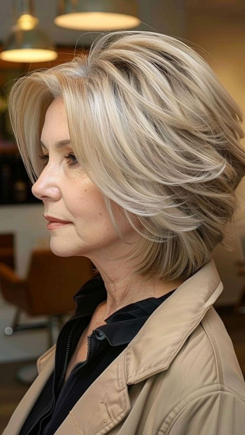 Face-framing layers add movement and volume to thinning hair. The side-swept bangs soften facial features while the bob length requires minimal styling time. This classic cut works beautifully with grey tones, creating dimension that catches the light.