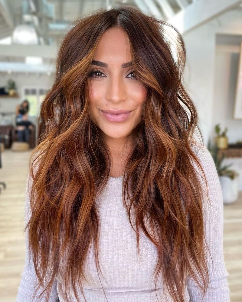 Shine with copper glow. This balayage adds vibrant, fiery tones that catch the light beautifully. A bold choice for brunettes eager to stand out and add a touch of brilliance to their look.