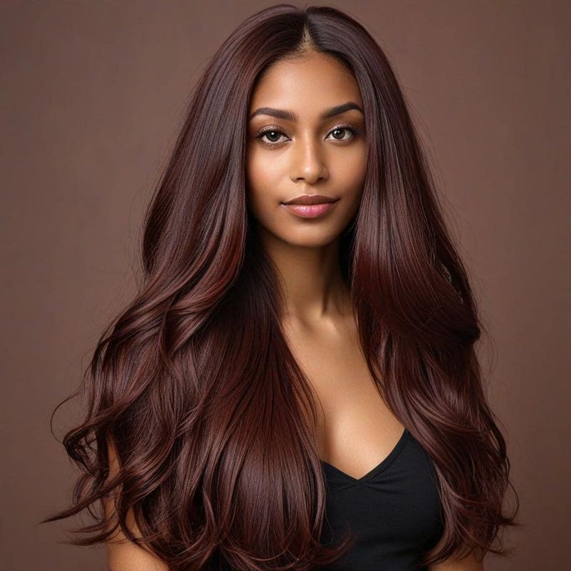 Chocolate cherry hair offers a rich, luscious blend of deep brown and red tones, ideal for those seeking an elegant yet bold look. This color is both sophisticated and daring.