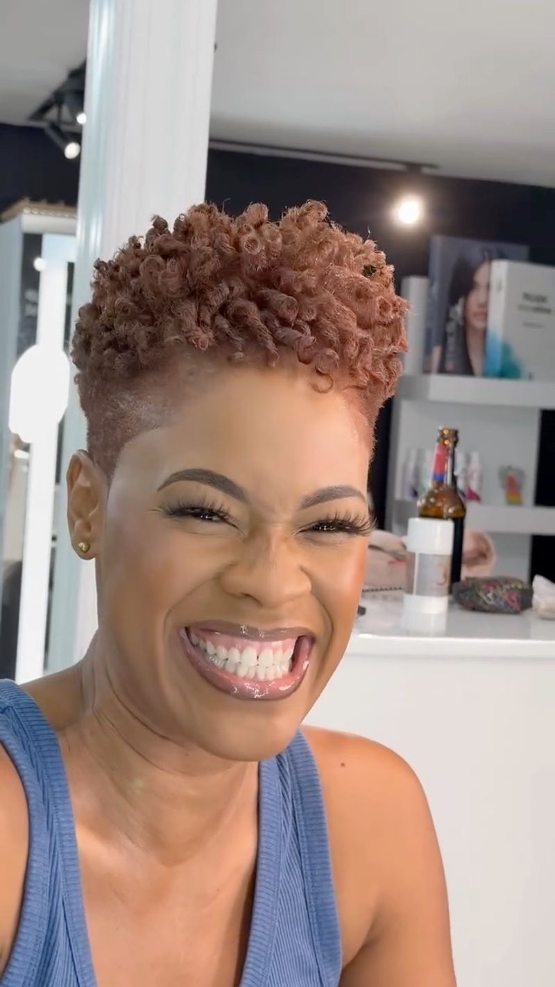 Embrace your natural curls with this voluminous pixie that features closely tapered sides and more length on top. The height from your curls creates a lengthening effect on round faces.