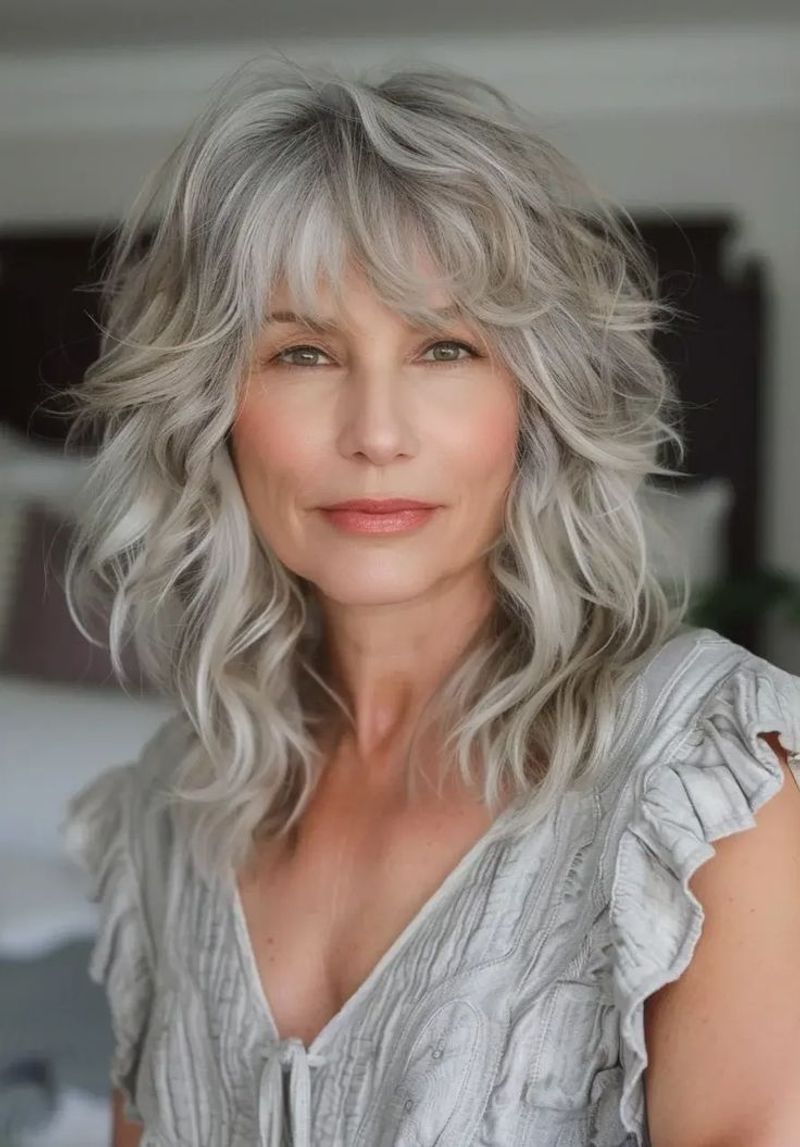 Today’s version features wispy, side-swept bangs that disguise forehead lines while maintaining feminine softness. The technique particularly flatters mature women transitioning to natural gray coloring.