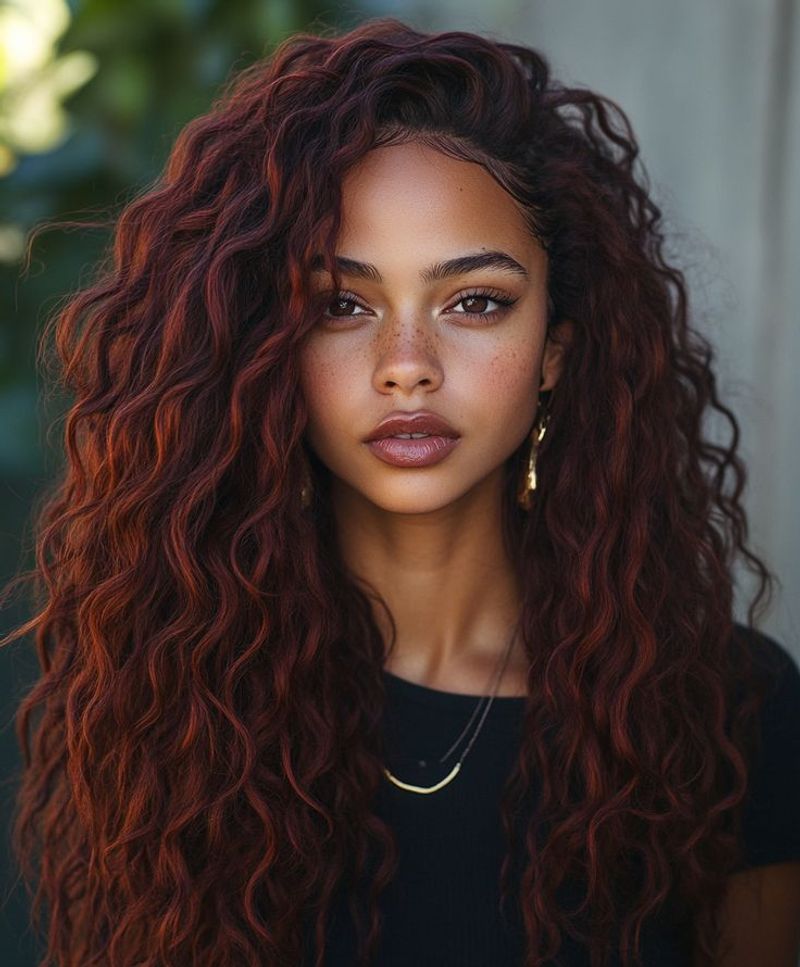 Deep reddish-brown auburn tones enhance natural undertones in darker complexions. The subtle red cast appears differently in various lighting, creating a multi-dimensional effect.