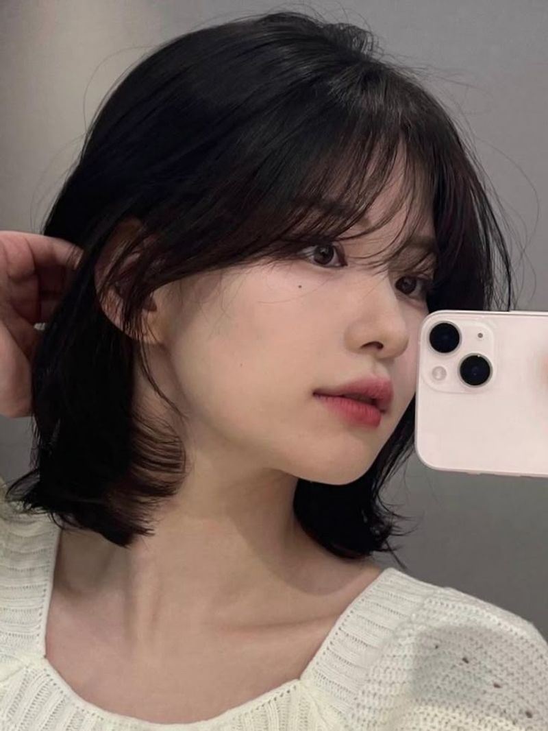 Gently arched Korean-inspired bangs follow the curve of the eyebrows, creating a face-framing effect that’s both soft and structured. The slight curve balances roundness while drawing attention to your eyes.