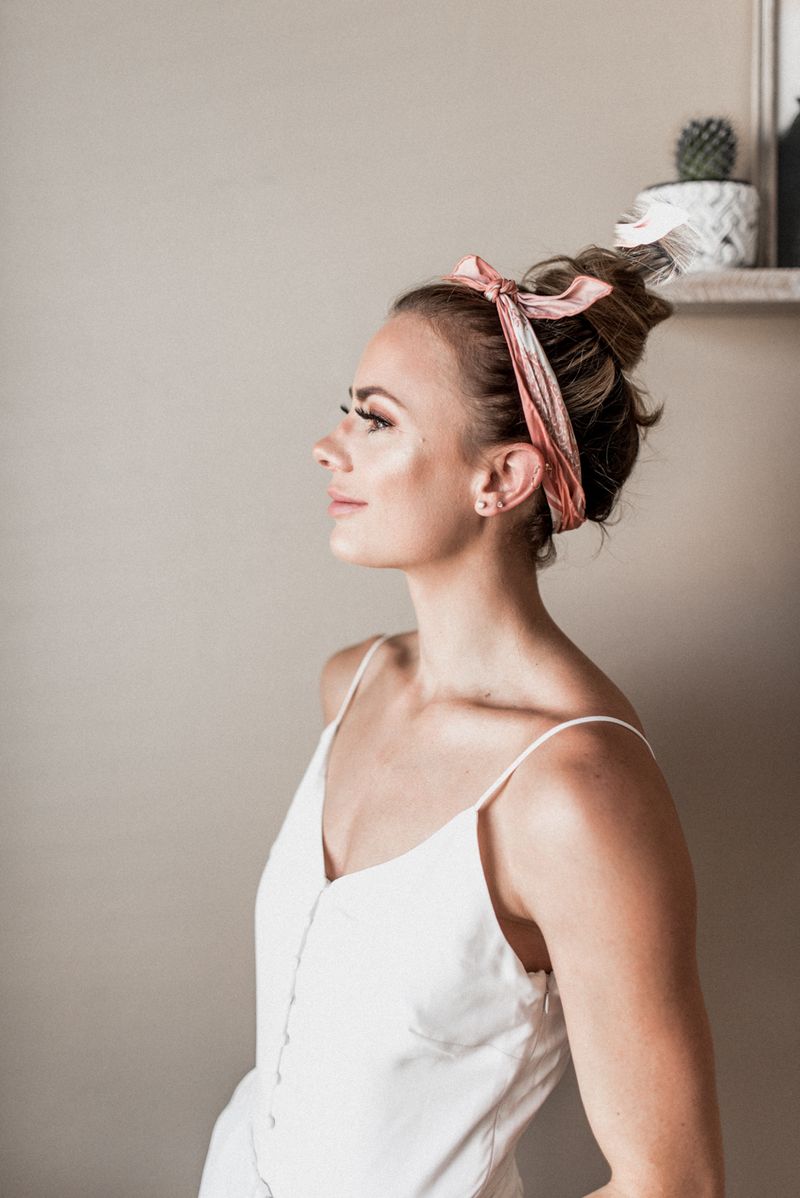 Fold a colorful bandana into a headband, wrap around hairline, then gather hair into a high bun. The retro-inspired look adds instant personality to casual outfits.