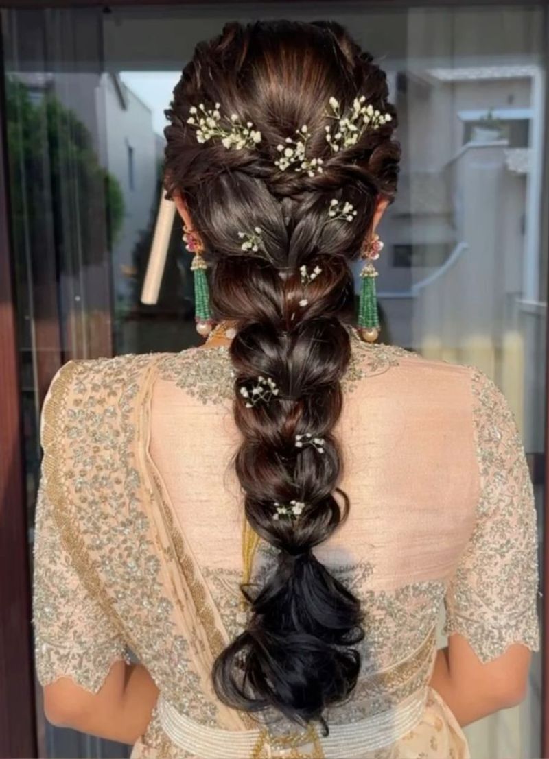 Enhance a simple braid with fresh flowers for a charming, nature-inspired look. This style is suitable for outdoor weddings, adding a touch of romance and whimsy.
