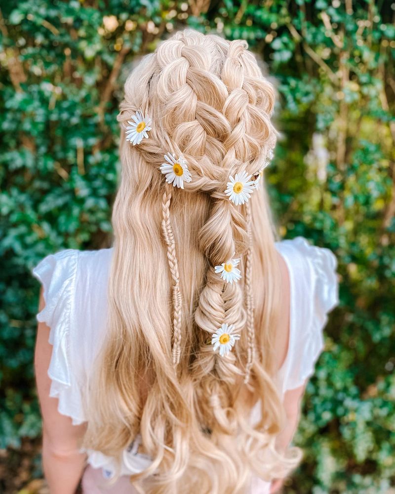 Fresh flower braids are a delightful way to bring nature into your look. Perfect for outdoor weddings, these braids, intertwined with vibrant blooms, create a youthful, joyful appearance that’s both charming and whimsical.