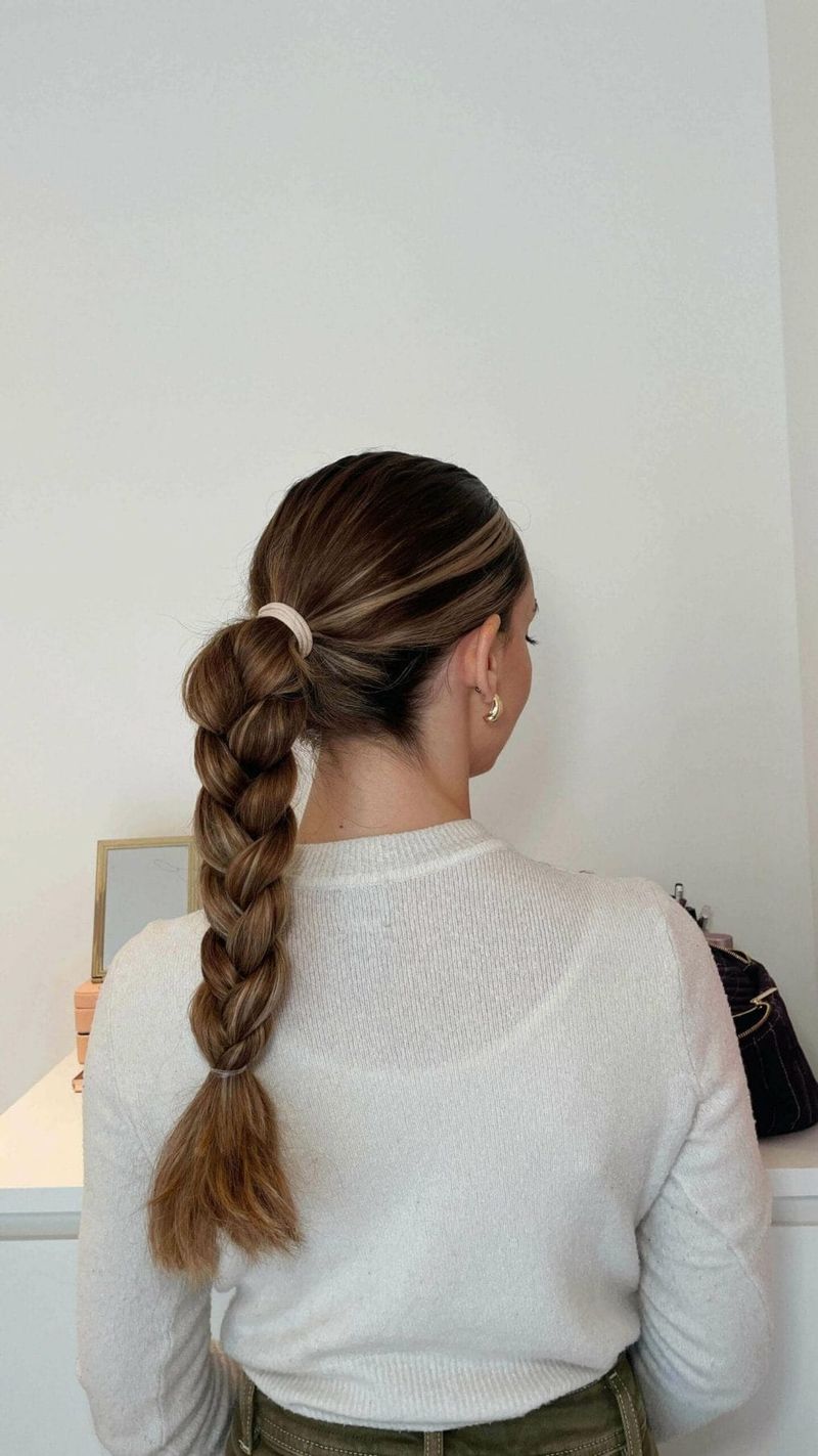 This classic braided ponytail is both functional and stylish. It begins with a high ponytail that’s tightly braided down the back. In addition to keeping hair secure, this style adds a sporty flair to your look.