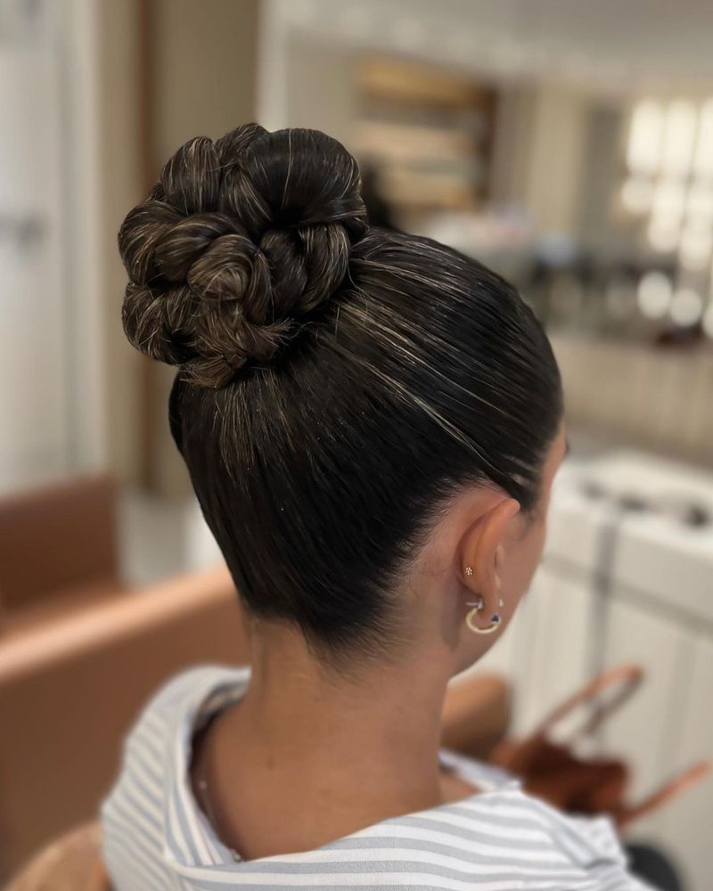 The low bun with braids combines sophistication with practicality. Braids are woven into the hair, leading to a low bun that stays in place while offering a polished look.