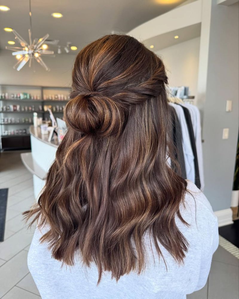 Twist your way to elegance with a half-up twisted bun. Twist the top sections and pin them into a bun. This style is sophisticated yet relaxed, making it perfect for both casual gatherings and festive occasions.